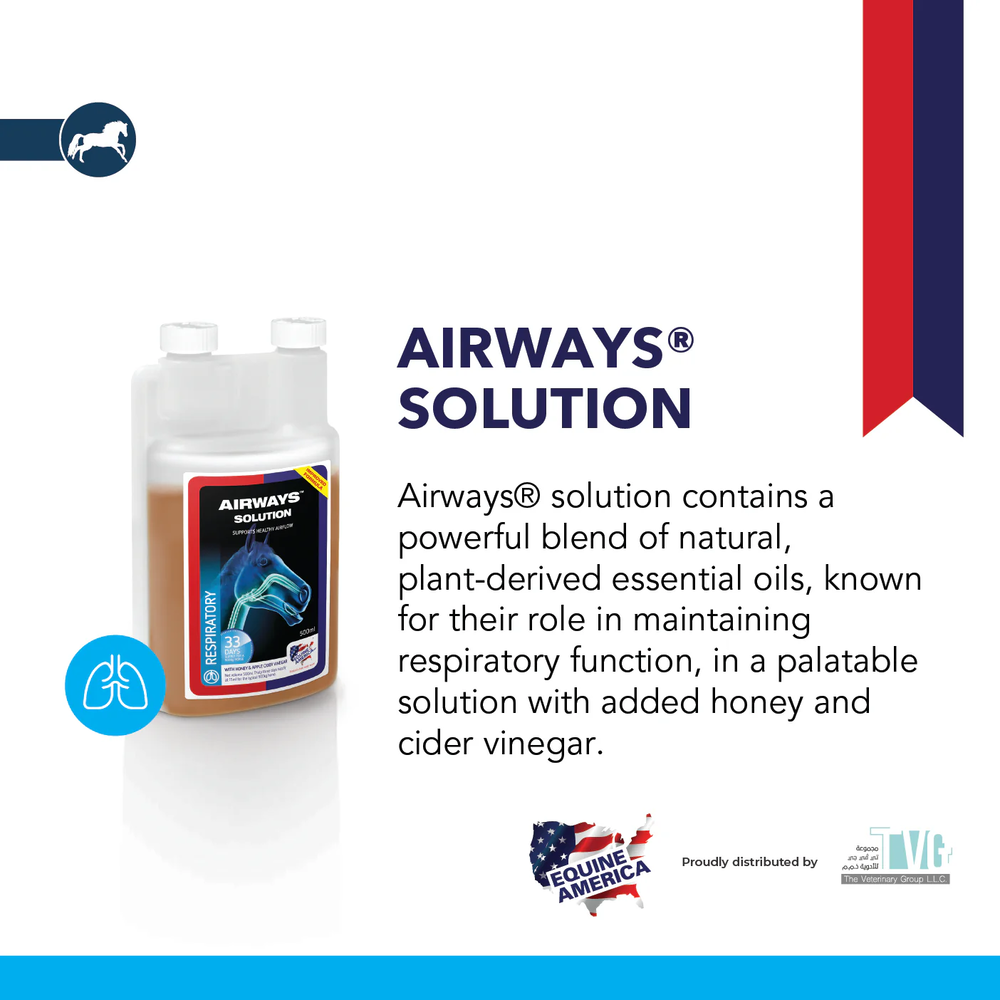 يمكن أن يساعد الدعم الغذائي المستهدف في تعزيز دفاعات الحصان الطبيعية ضد مثل هذه التحديات، ويحتوي Airways Solution على مزيج قوي من الزيوت الأساسية المشتقة من النباتات للمساعدة في فتح مجاري الهواء والحفاظ على صحة الجهاز التنفسي. كما يشتمل على العسل وخل التفاح للمساعدة في تهدئة الجهاز التنفسي.