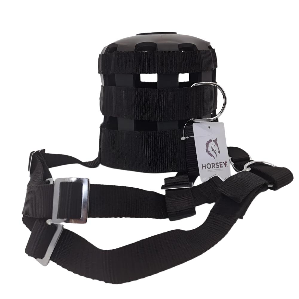 يعمل هذا الكمامة المصنوعة من النايلون على إبطاء حركة الحصان. تتميز بقاعدة مطاطية وغطاء رأس بشريط لاصق ورباط حلقي لسهولة التركيب والحفاظ على الكمامة في مكانها.