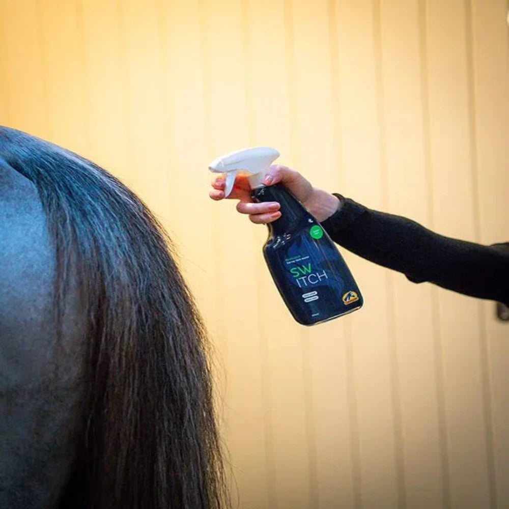 · يعمل منتج Cavalor SwItch بعدة طرق. فهو يخفي رائحة جسم الحصان، ويبقي البعوض بعيدًا. وهذه خطوة مهمة في منع الحكة. كما يحتوي على مواد مرطبة ومغذية تعمل على تهدئة البشرة المتهيجة والحكة.