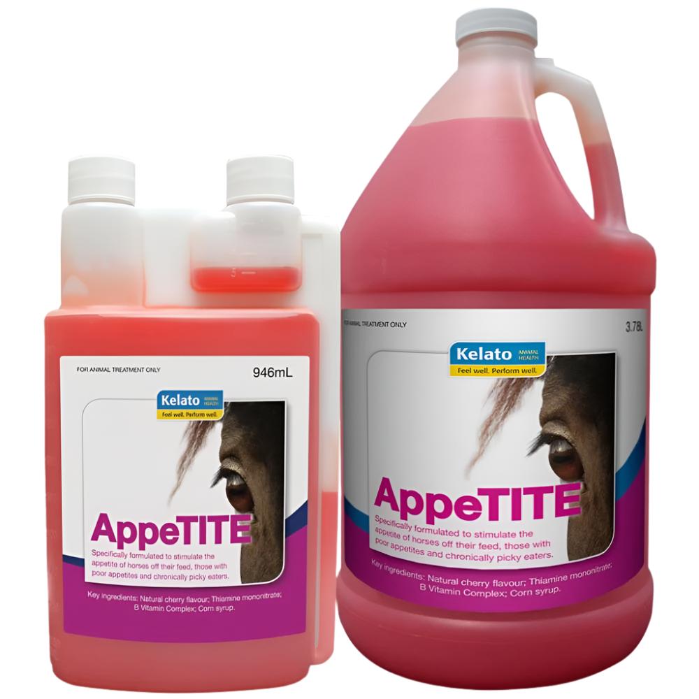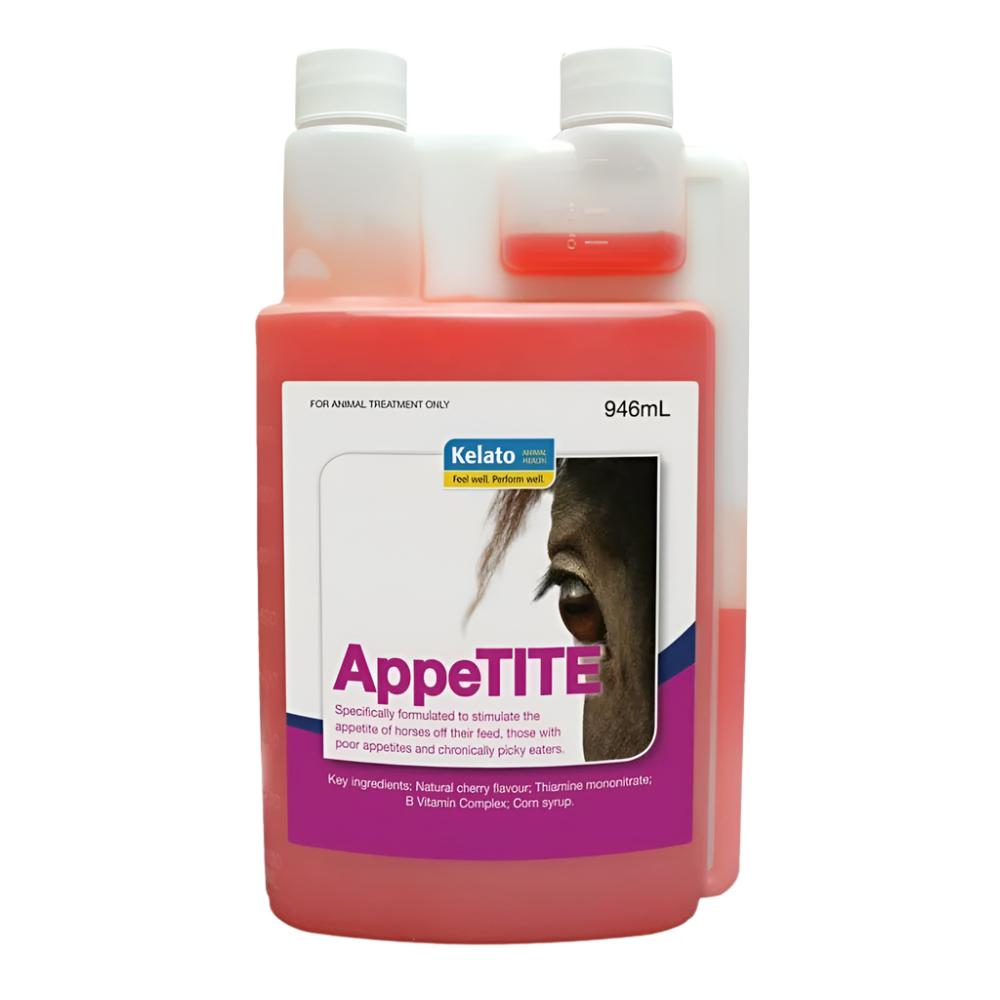 AppeTITE is a highly palatable, cherry flavoured liquid that stimulates hunger and encourages eating when horses are off their feed. AppeTITE is a liquid formula that can be used on a daily basis to improve eating habits or strategically for horses off their feed.