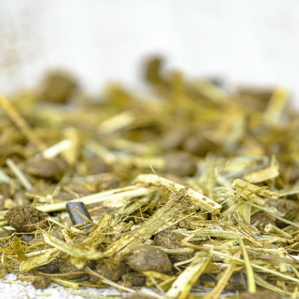 Linseed Husks, Alfalfa Pellets, Sunflower Seed Meal, Alfalfa Stems, Spelt Hulls, Oat Hulls, Soya Oil, Timothy Pellets, Peas, Beet Molasses, Linseed, Dried Beet Pulp, Monocalcium Phosphate, Sodium Chloride, Coconut Fat, Calcium Carbonate, Fructo-Oligosaccharides.