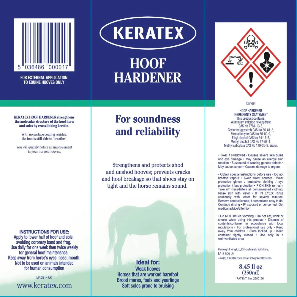 · Since it first became available to horse owners in 1990 as the first product of its kind, Keratex Hoof Hardener has shown to improve hoof quality. Keratex Hoof Hardener is recommended by vets and farriers worldwide.