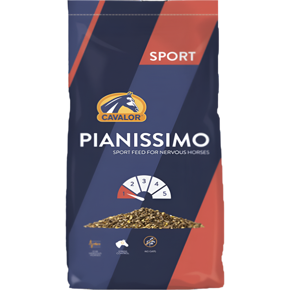 Cavalor Pianissimo is a sports muesli for nervous horses. Oat-free formula. With flaked cereals for easy digestion and prebiotics and probiotics to support optimal gut function, the foundation for natural resistance.